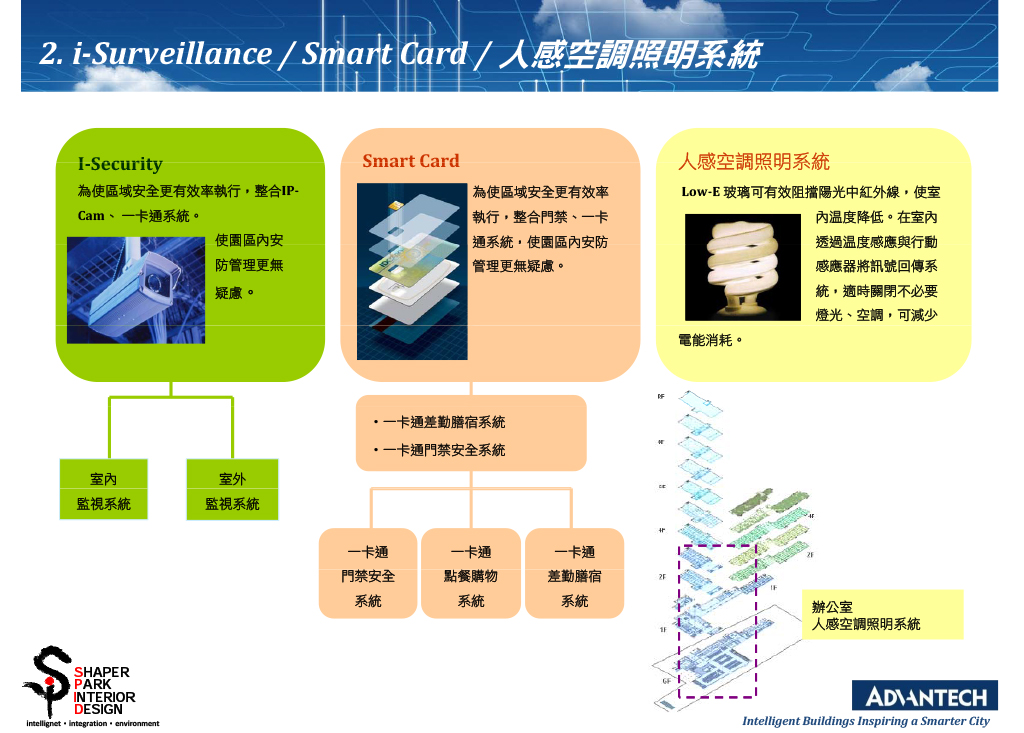 Through the practice of integrating spatial design and intelligent applications for the office, Shaper Park can professionally and meticulously conduct environmental design, from lighting design, height and placement specifications to color and material selections, all with careful calculations and discussion. Integrating chaotic and complex devices, overcoming distance limitations, establishing scenario controls, intelligent receptions and smart interactions, the efficiency, comfort and convenience of the business environment can be significantly improved. In the architectural space, the main design and style, integrating and linking e-control systems, central surveillance, energy management through IT controls, building management through digital controls that is more systematic and more convenient can be achieved through Shaper Park’s strategic project planning. Shaper Park hopes to provide an optimized business environment, helping the user achieve greater benefits.